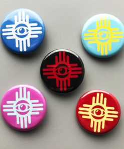 Our EYE ZIA buttons are durable and have a clasp on the back. Dimensions are 1.25″ x 1.25″.