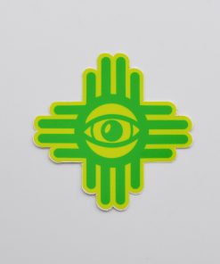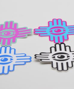 Our Eye Zia stickers are hand printed and hand cut. Screen printed on gloss vinyl.