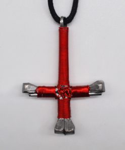 This inverted metal cross necklace is made of durable materials and comes with leather rope. Dimensions of pendant are 2.25″ x 1.5″.