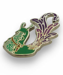 Our Laser Slug Enamel Pins have a silver color base with two pin posts on the back. Dimensions are 1 1/2″ x 1 3/4″. These handsome pins reflect light from their smooth metal and paint surfaces for a true touch of flare.