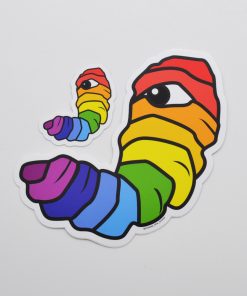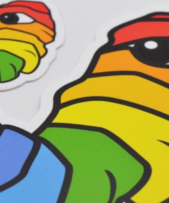 Our machine cut vinyl stickers are outdoor rated and UV resistant. Our PRIDE MAGGOT sticker is available in a mini 2″ x 1″