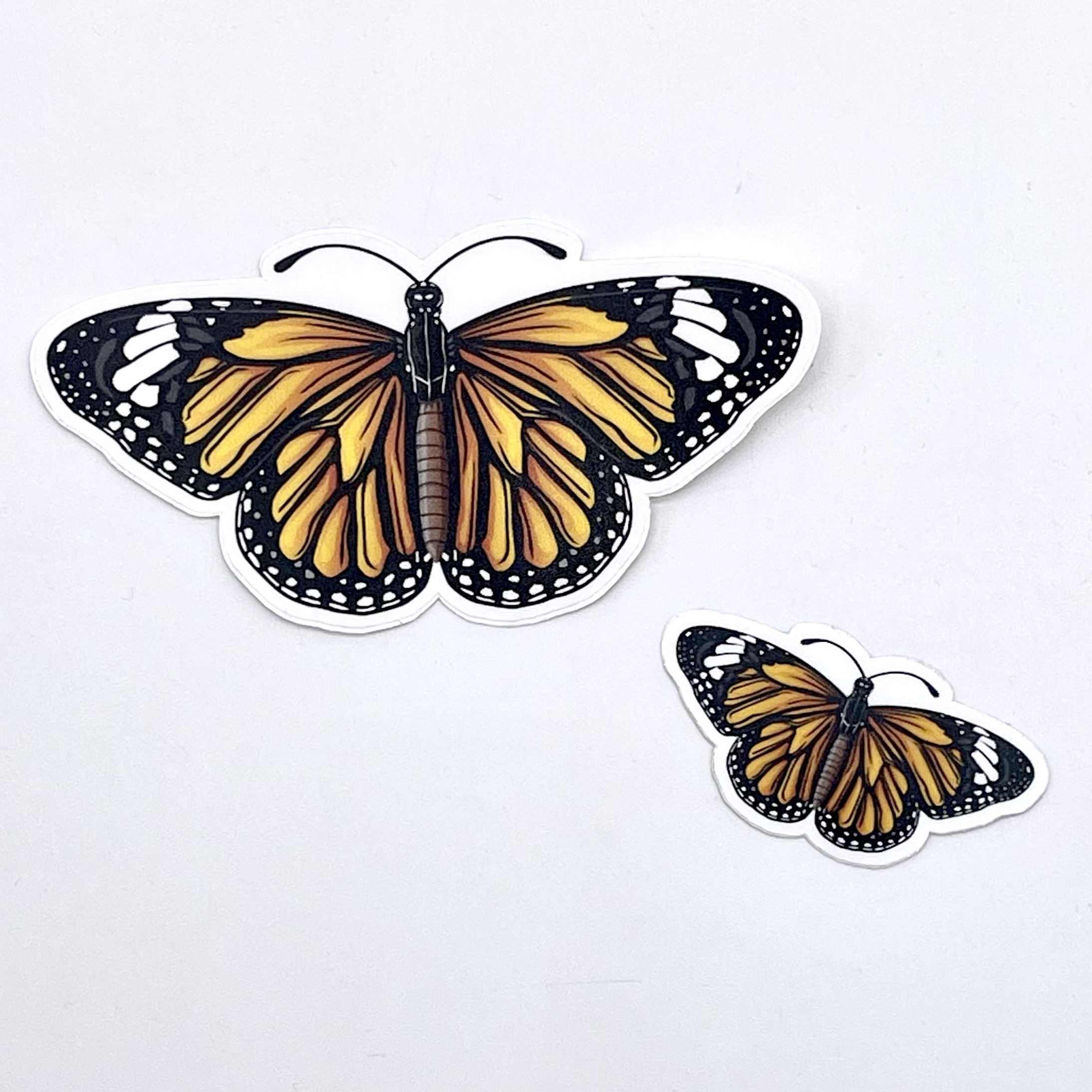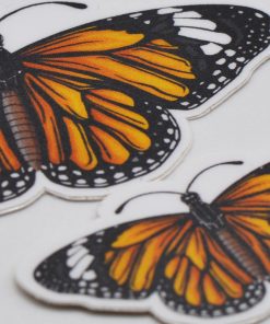 Our Monarch Butterfly machine cut vinyl stickers are outdoor rated and UV resistant. Available as a jumbo sticker 1.5″ x 3″ or a smaller 1″ x 2″. Satin finish.