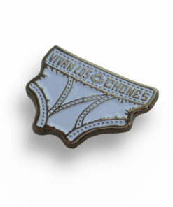 Our Vivan Los Chones Enamel Pins have a black base with a single pin post on the back. Dimensions are 3/4″ x 1″. These handsome pins reflect light from their smooth metal and paint surfaces for a true touch of flare.